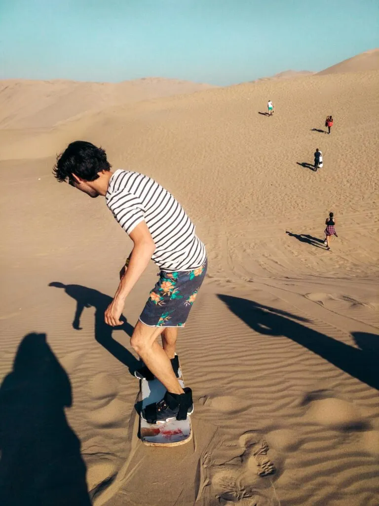 Vanuit Huacachina vertrek je in een buggy naar de zandduinen. Alleen de rit zelf is al geweldig, want je rijdt op volle snelheid over de heuvels. Bij aankomst midden in de woestijn krijg je een plank om mee te gaan sandboarden. Er zijn verschillende manieren om de heuvels af te gaan, namelijk liggend op je buik, zittend of staand.